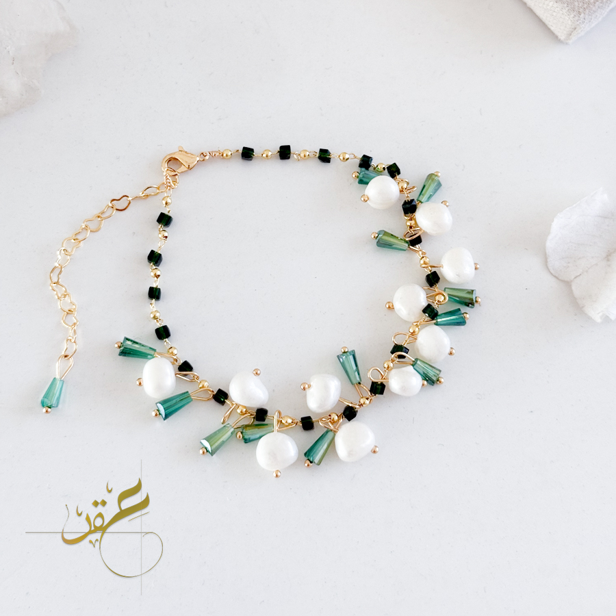 خلخال لولو طبيعي freshwater pearl مع احجار باللون الاخضر