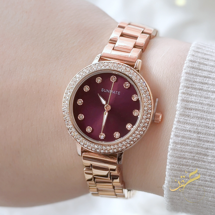 ساعة روز جولد ومينا محجرة مع لون بورجندي – ماركة Sunmate