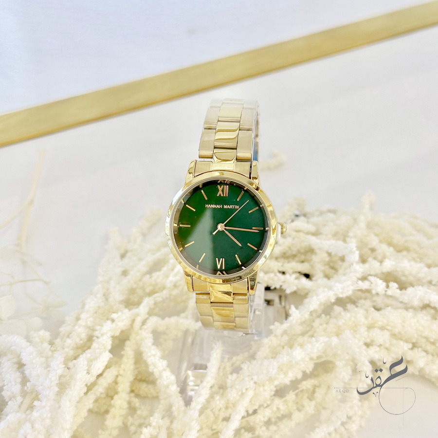 ساعة ستاتية من Hannah Martin مع كاسكيت لون ذهبي مع مينا لؤلؤية لون اخضر