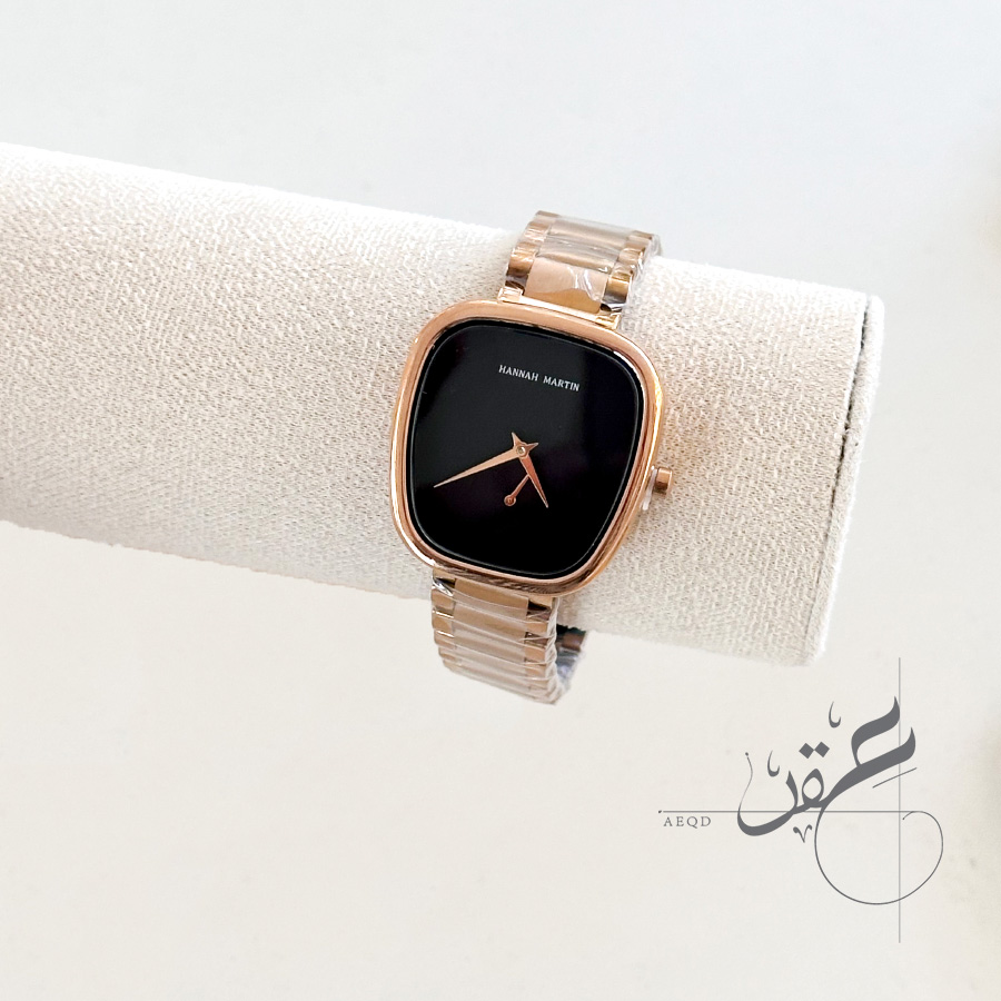 ساعة من Hannah Martin مع كاسكيت لون روز جولد ومينا اسود