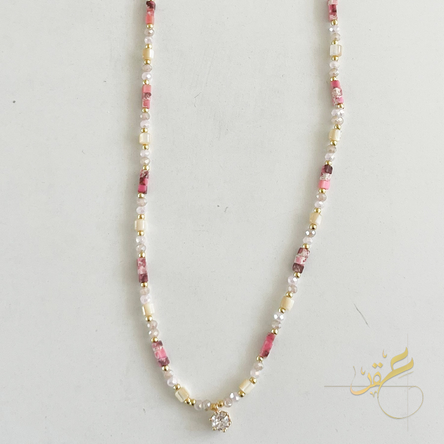 سنسال باحجار باللون الزهري مع قلادة مدورة من حجر الزركون